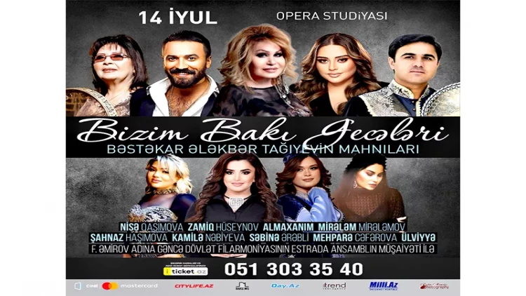 14 iyul "Bizim Bakı gecələri" konsert proqramında korifey bəstəkarı Ələkbər Tağıyevin əsərləri səhnəmizin ulduzlarının ifalarında və F.Əmirov adına Gəncə Dövlət Filarmoniyasının estrada ansamblın müşayiəti ilə Bakıda Opera studiyasının səhnəsində səslənəcəklər. Qonaqlar arasında xalq artistləri Nisə Qasımova və Şaxnaz Haşimova, Zamiq Hüseynov, Almaxanım, Mirələm Mirələmov, Kamilə Nəbiyeva, Səbinə Ərəbli, Ülviyyə, əməkdar incəsənət xadimi Mehparə Cəfərova və başqaları! Bakı Opera studiyasının və Gəncə Dövlət Filarmoniyasının birgə "Gəncədən Bakıya" layihəsi.